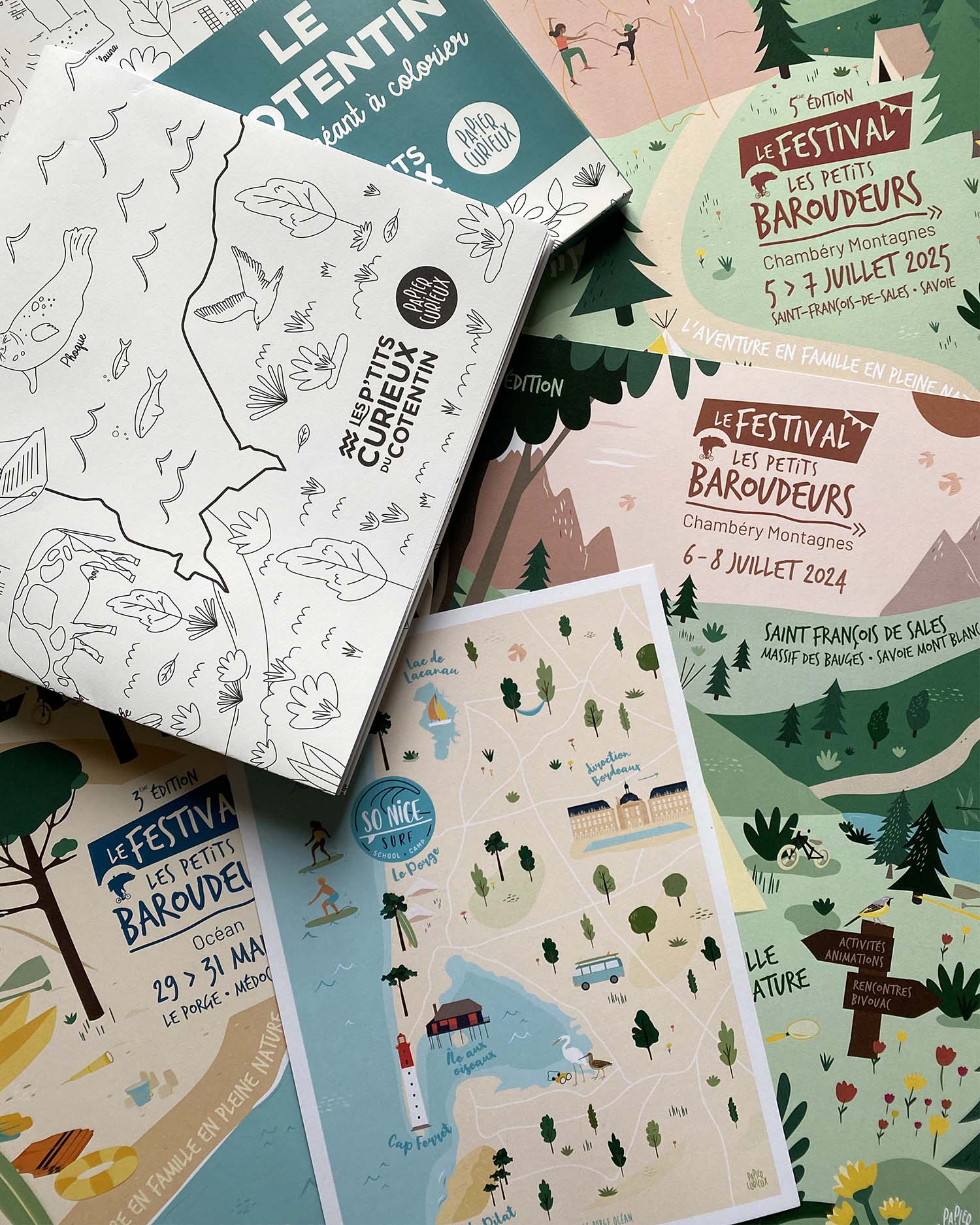 En 2024 et 2025, Les Petits Baroudeurs m’ont fait confiance pour illustrer les affiches de leurs festivals dans la nature.